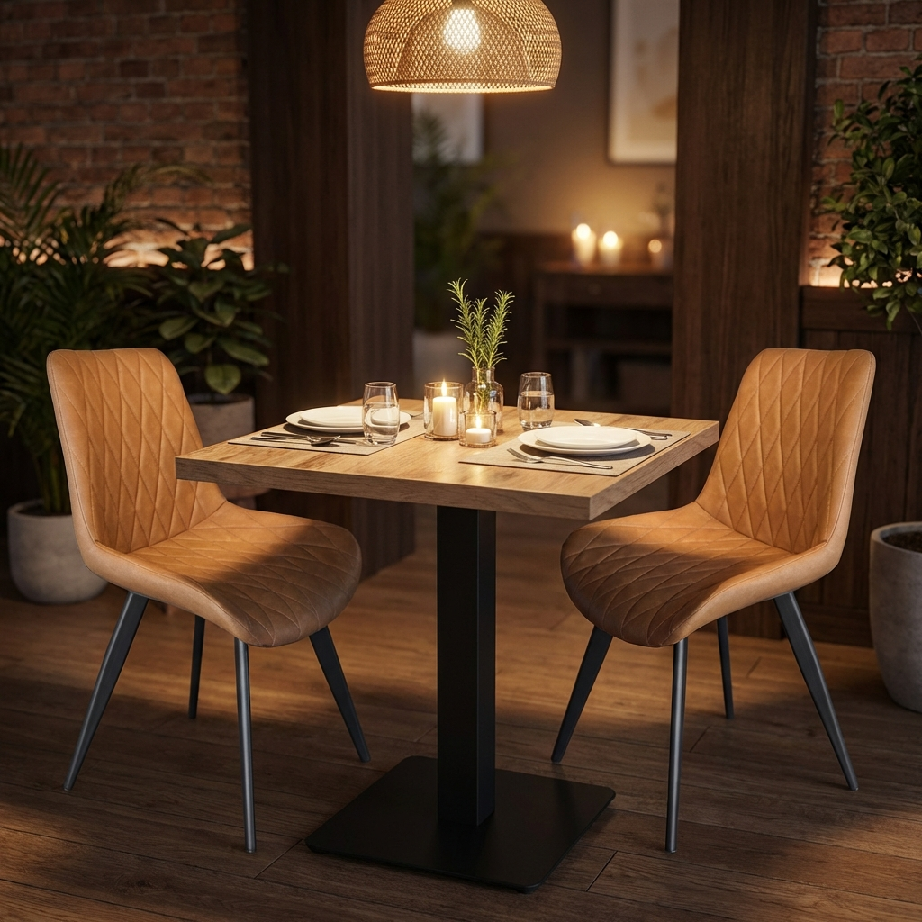 Wysokiej jakości zestaw restauracyjny składający się z dębowego stołu Andora i 2 ciemnobrązowych krzeseł Scarlet. Stół ma żeliwną nogę, a krzesła można wsunąć pod spód. Krzesło restauracyjne Scarlet i siedzisko wykonane z imitacji skóry w kolorze ciemnobrązowym.