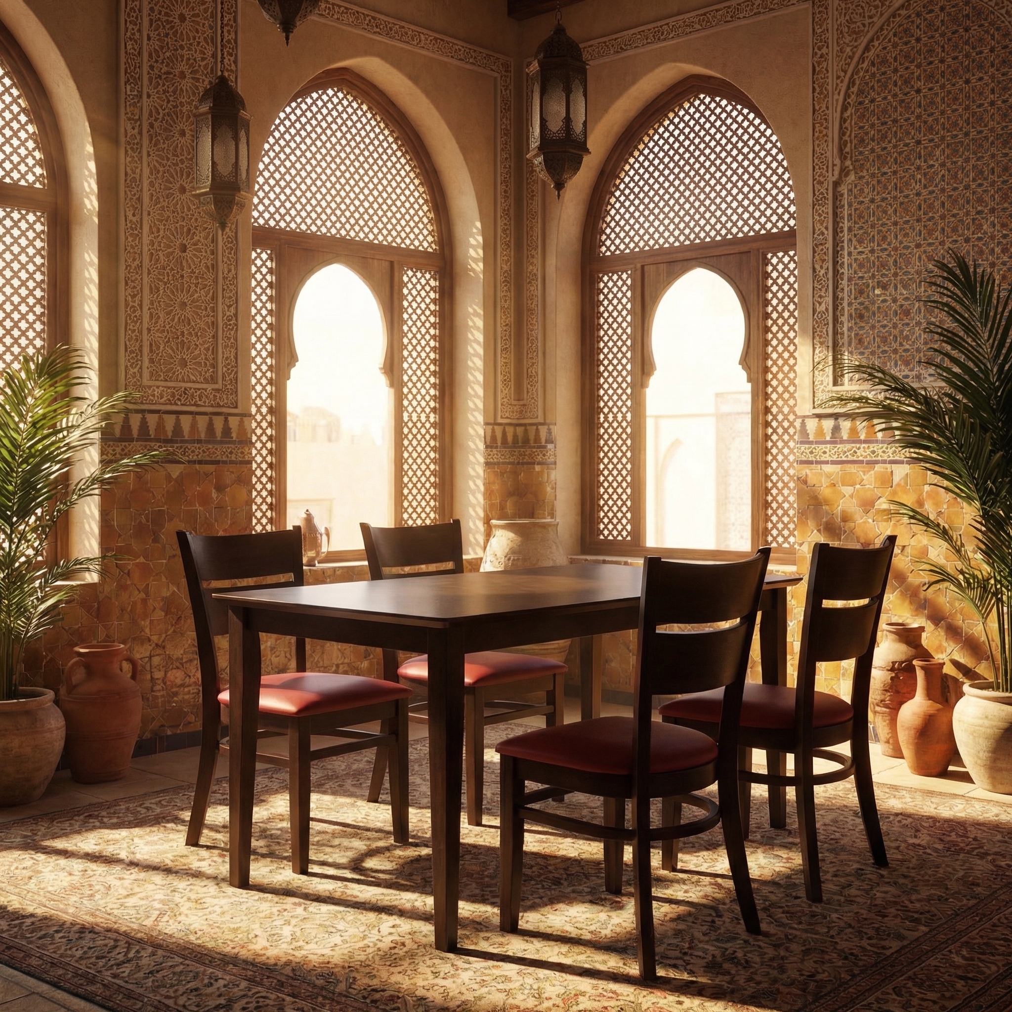 Zestaw z litego drewna z 1 stołem i 4 krzesłami. Dostępny również w rozmiarach 90x90 i 150x90 cm. Wygodne krzesła restauracyjne i klasyczny stół 120x75cm.