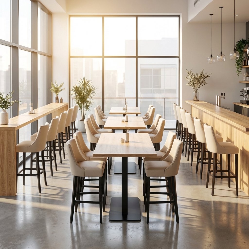 Stołek barowy Finja z oparciem i siedziskiem tapicerowanym imitacją skóry w kolorze brązowym i lekko zakrzywionym oparciem, dzięki czemu zapewnia wysoki komfort siedzenia. Odporna na rozdarcia imitacja skóry o grubości 1 mm z pianką o gęstości 35 RG z bardzo wytrzymałymi narożnikami, które nie zapinają się.