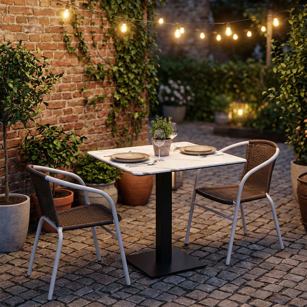 Stół zewnętrzny Catania o wymiarach 70x70 cm o wyglądzie marmuru w kolorze białym Kompaktowy blat HPL