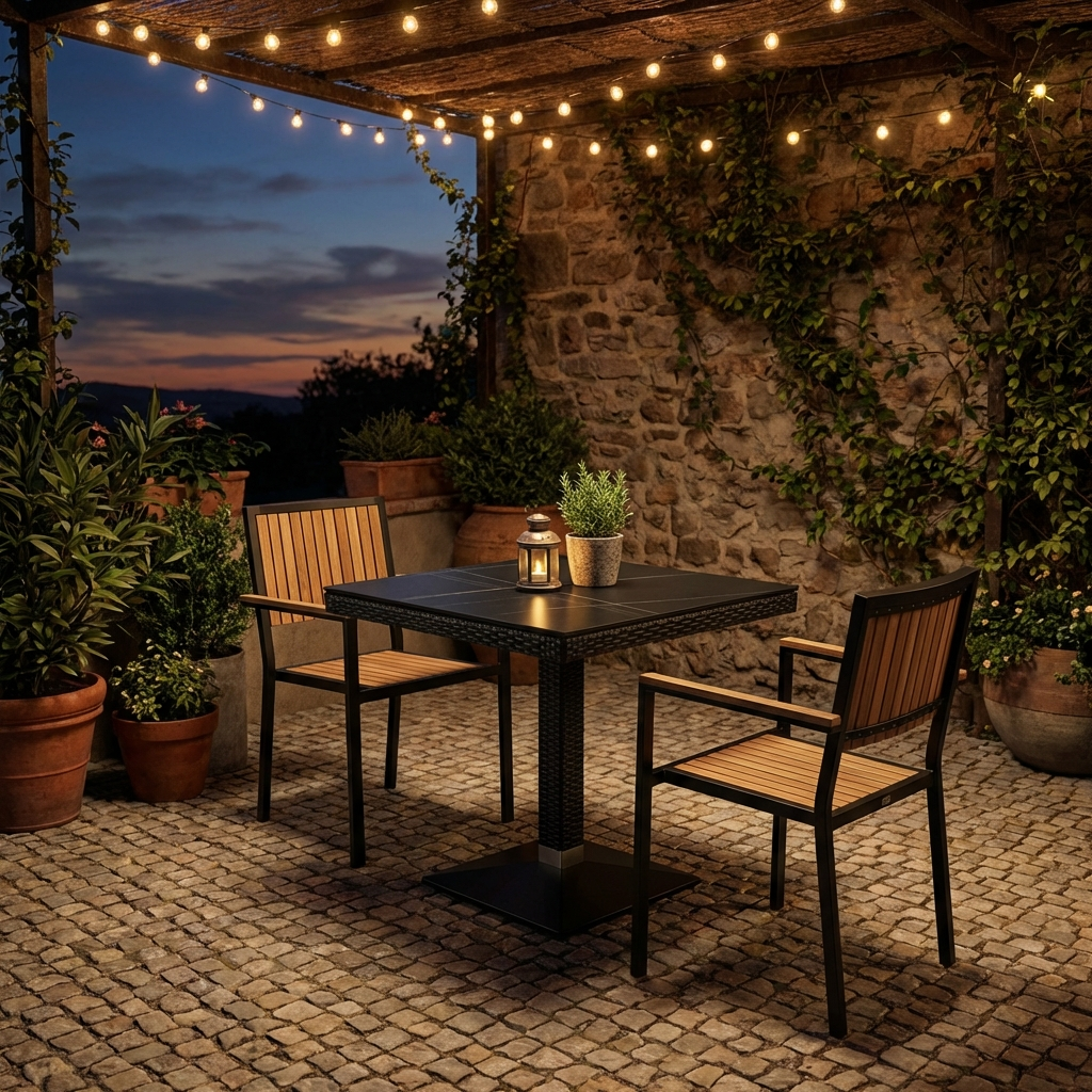 Stół restauracyjny do użytku na zewnątrz wykonany z polirattanu i szklanego blatu o marmurowym wyglądzie w rozmiarze 70x70 cm.